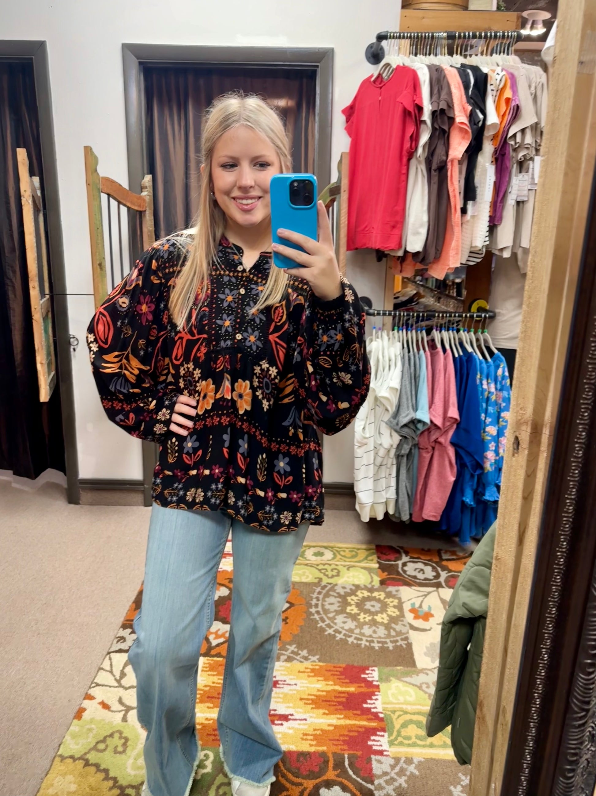 This Black Ash Gauze Woven Top features a lightweight rayon fabric with a delicate floral and botanical print, offering a refined yet relaxed silhouette. Balloon sleeves with elastic smocked cuffs provide subtle volume and comfort, while the front button detail on the yoke adds a tailored touch. Ideal for layering or wearing alone, this top combines effortless style with expert craftsmanship.