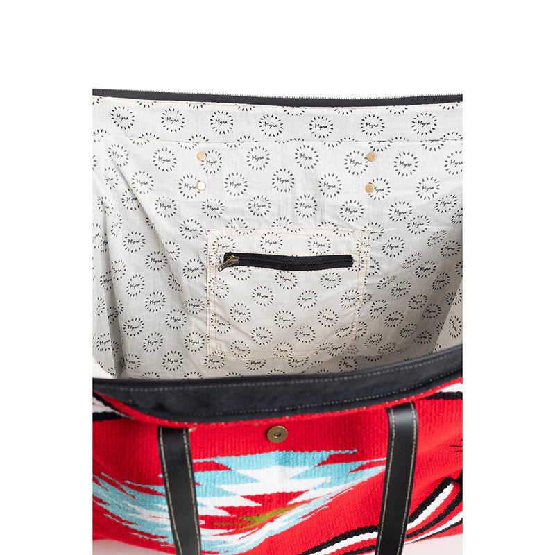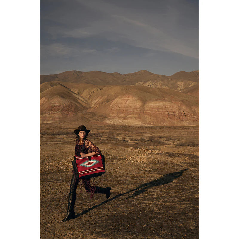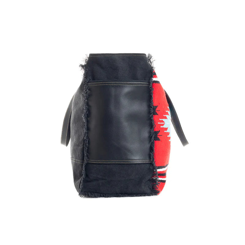 Make every journey more vibrant with this western weekender bag, featuring a striking tribal-inspired upcycled rug in bold red and turquoise hues. The coal-woven artisanal canvas back and ends add a rustic touch, while genuine leather accents double as handy slip pockets. Designed for function and style, it includes an inside zipper pocket, a phone compartment, and a side water bottle pocket. Durable leather carrying straps complete this eye-catching western luggage bag, perfect for your next adventure!