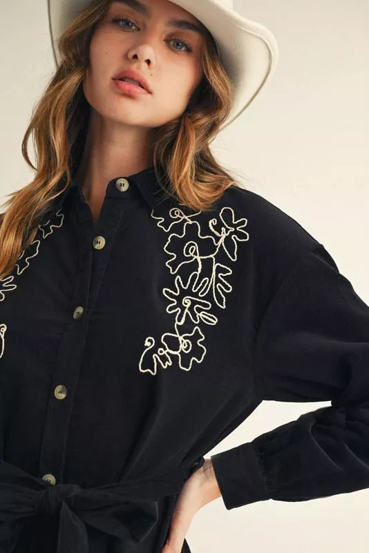 Long sleeves button down corduroy midi dress with side pockets, 3D floral pattern, roll up sleeves, waist tie.