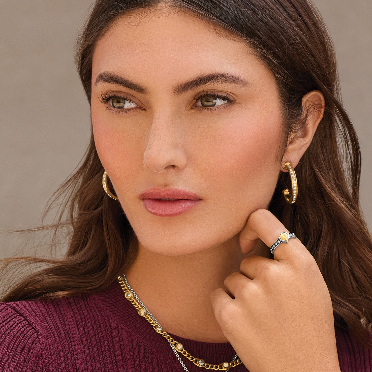 A golden heart surrounded by silver beaded details is a romantic accent and the two-tone versatility makes it perfect to wear with all your gold and silver pieces.