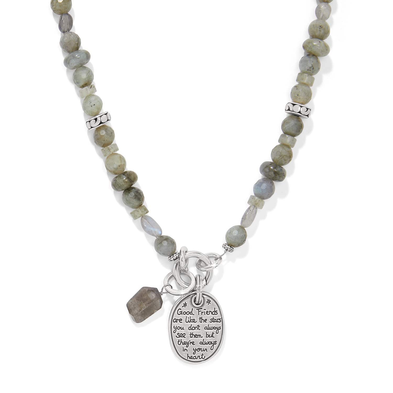 This necklace with semi-precious labradorite beads has a removable and reversible gemstone charm and sentiment-etched token. It has a romantic and organic feel. Back inscription reads, good friends are like the stars you don't always see them, but they're always in your heart.