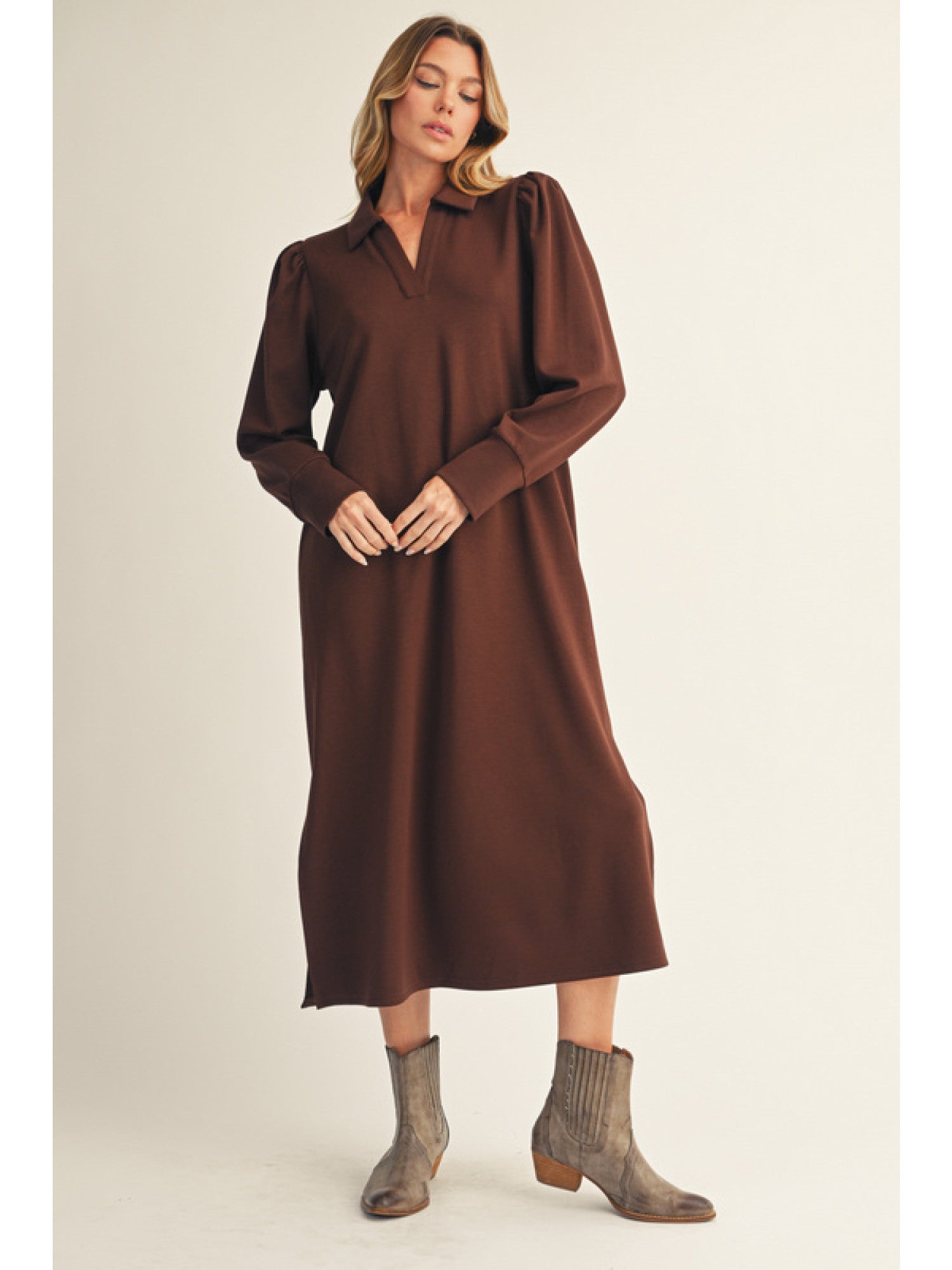 The Dakota Dress combines city sophistication with Western charm in a sleek midi silhouette. Featuring long sleeves and a classic collared neckline, its puffy shoulders add a bold, stylish edge. A side slit ensures ease of movement and a subtle hint of allure, making it perfect for both urban adventures and laid-back gatherings. This solid-colored dress offers versatile elegance with a contemporary touch.