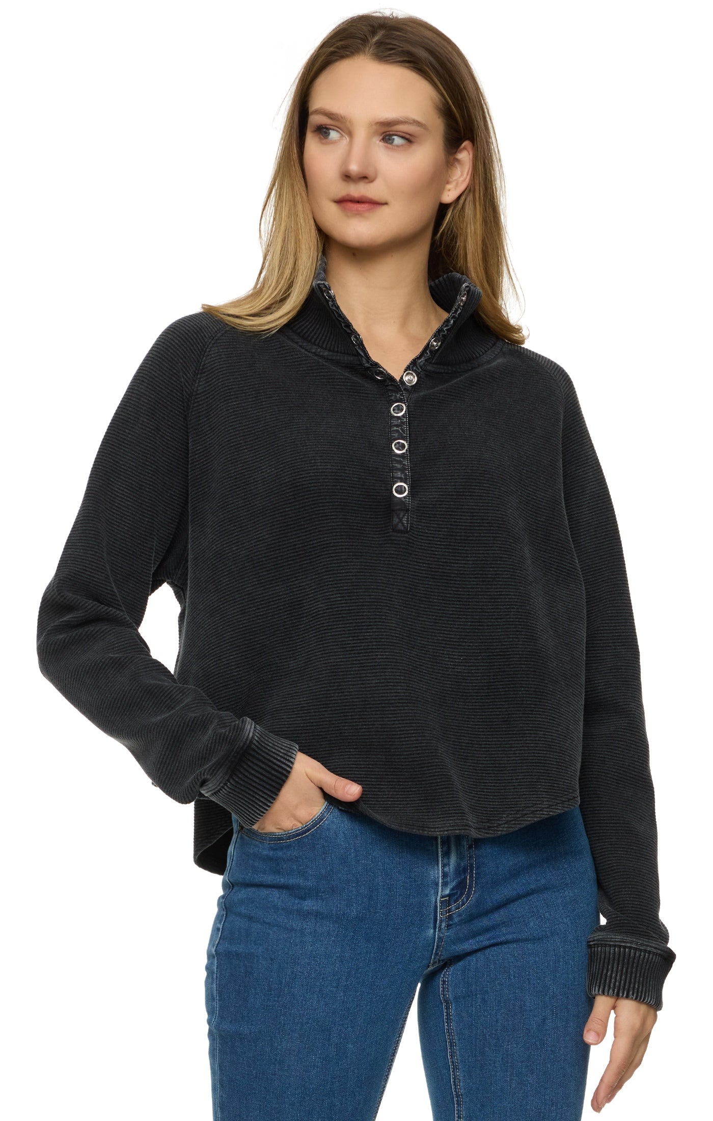Our Adriana Snap Front Pullover is a throw-on-and-go wardrobe staple, a great layering piece as the cooler weather rolls in. The ribbed fabric is lightweight and the snap front on the mock turtle neckline is comfortable and cozy. P