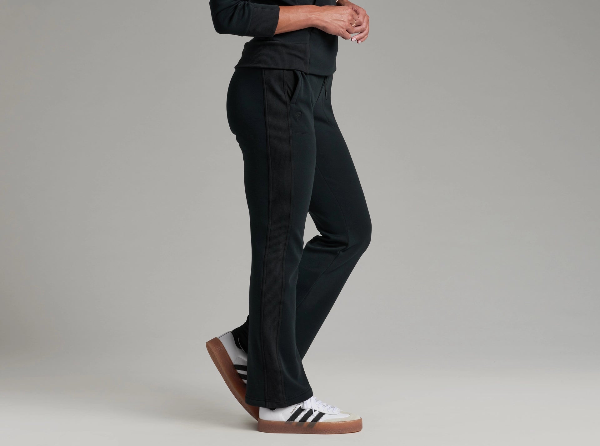 Ribbed panels down the sides add visual interest while enhancing mobility. A slight bootcut works with almost any footwear.