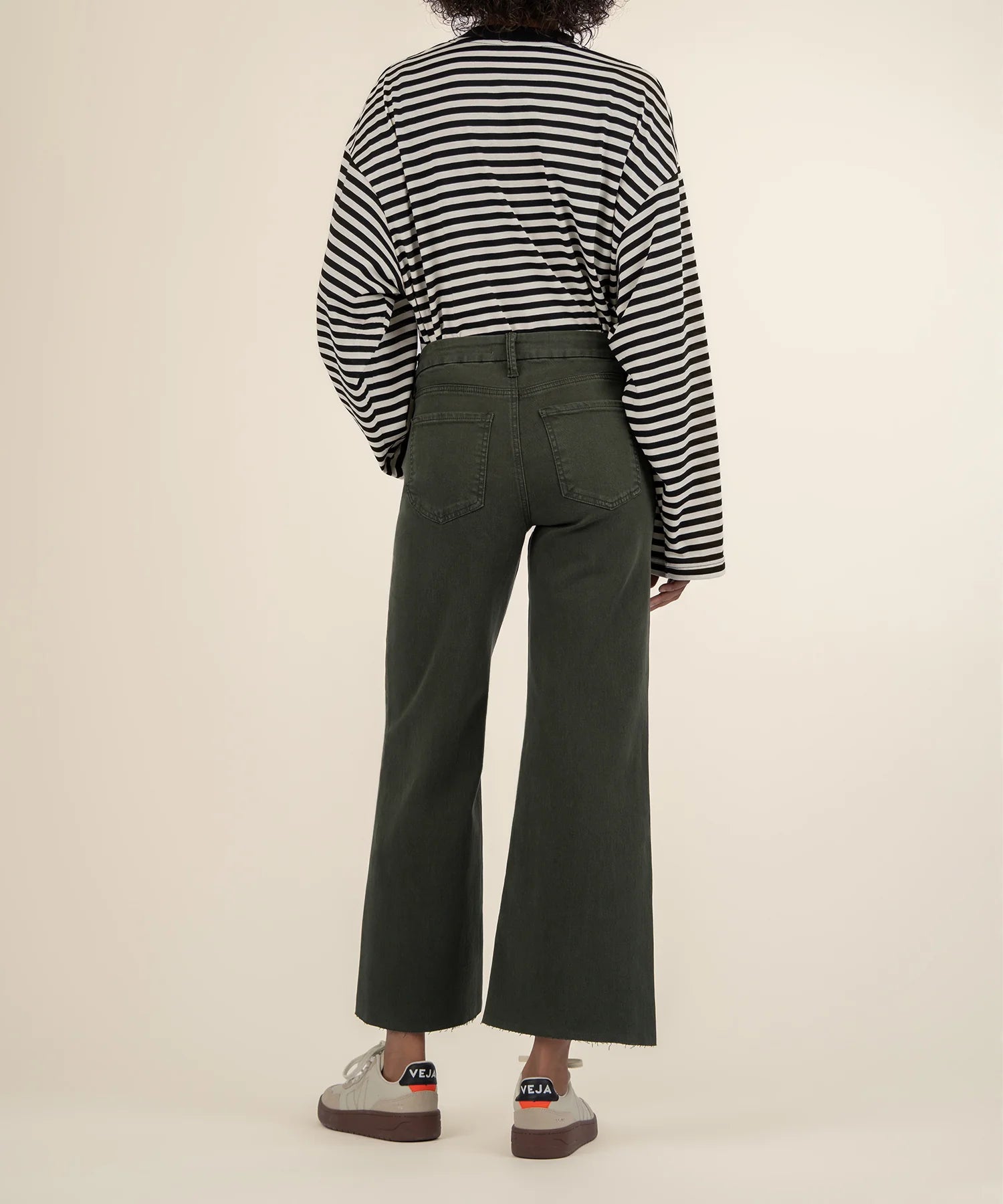 - These high rise wide leg jeans feature our signature Fab Ab pockets for a flattering fit. Made with super stretchy fabric and finished with a trendy raw hem, they combine comfort and modern style effortlessly.
