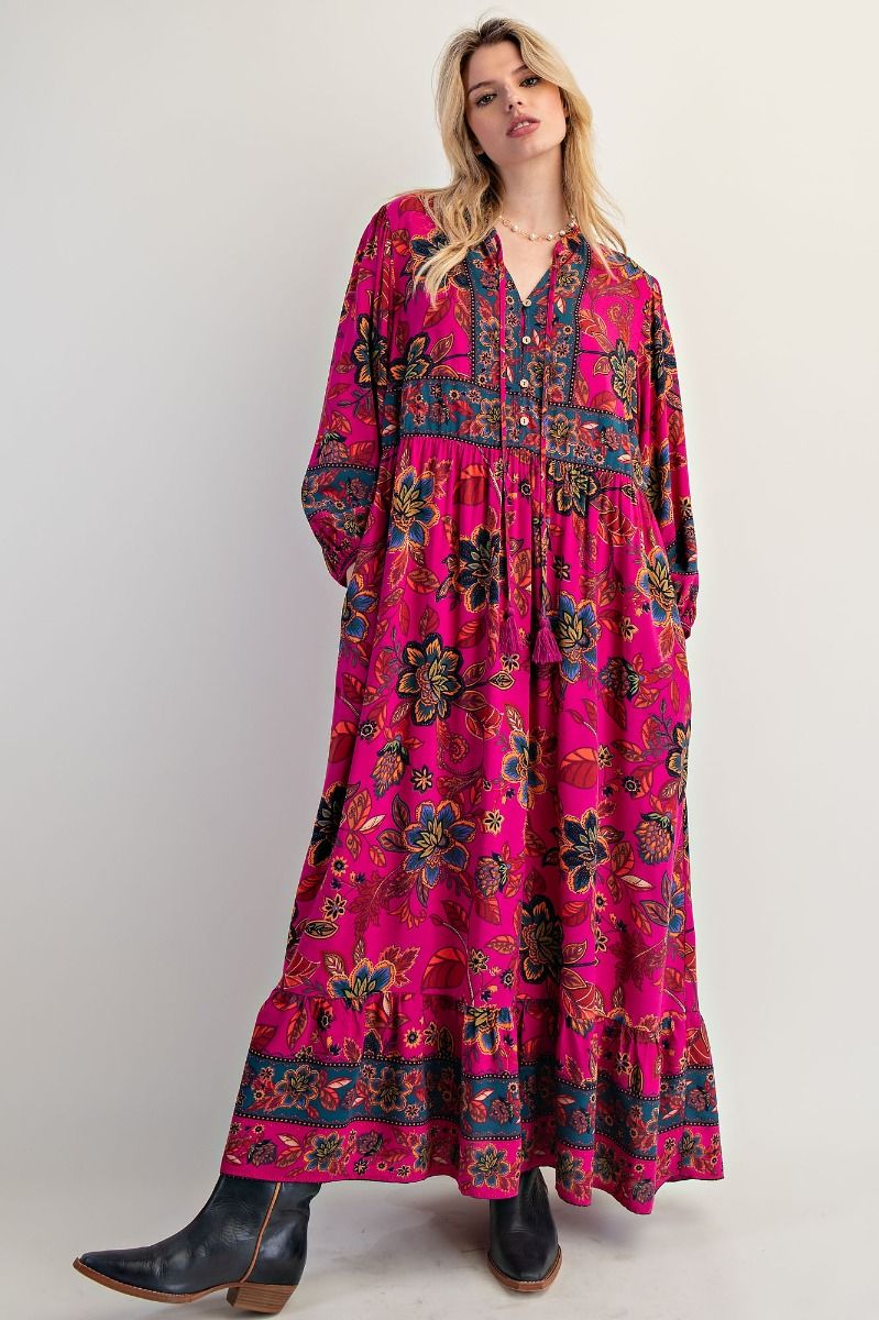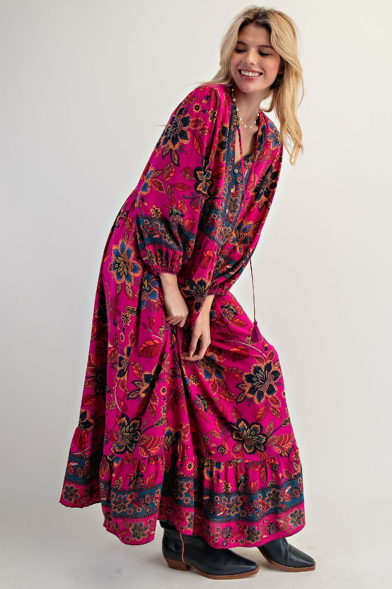 Embrace effortless elegance with the Magenta Floral Dress, crafted from soft rayon challis for a loose, flowy fit that moves with you. Its flattering V-neckline features delicate button detailing, complemented by tassel tie strings for a touch of charm. Long puffed sleeves with elasticized cuffs add a romantic, vintage-inspired flair, making this maxi dress perfect for any occasion where comfort meets style.