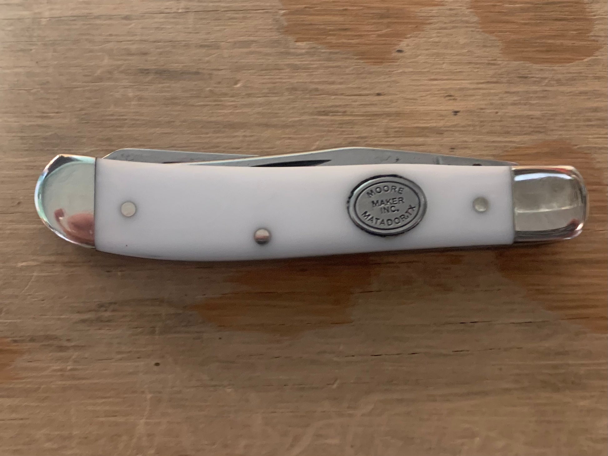 This knife from Moore Maker features smooth Delrin handles. Each has a Moore Maker shield imbedded into the handle, and MOORE MAKER, INC., MATADOR TEXAS on mark side of blade tang. MADE IN U.S.A.