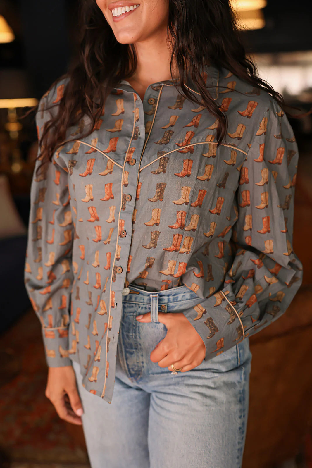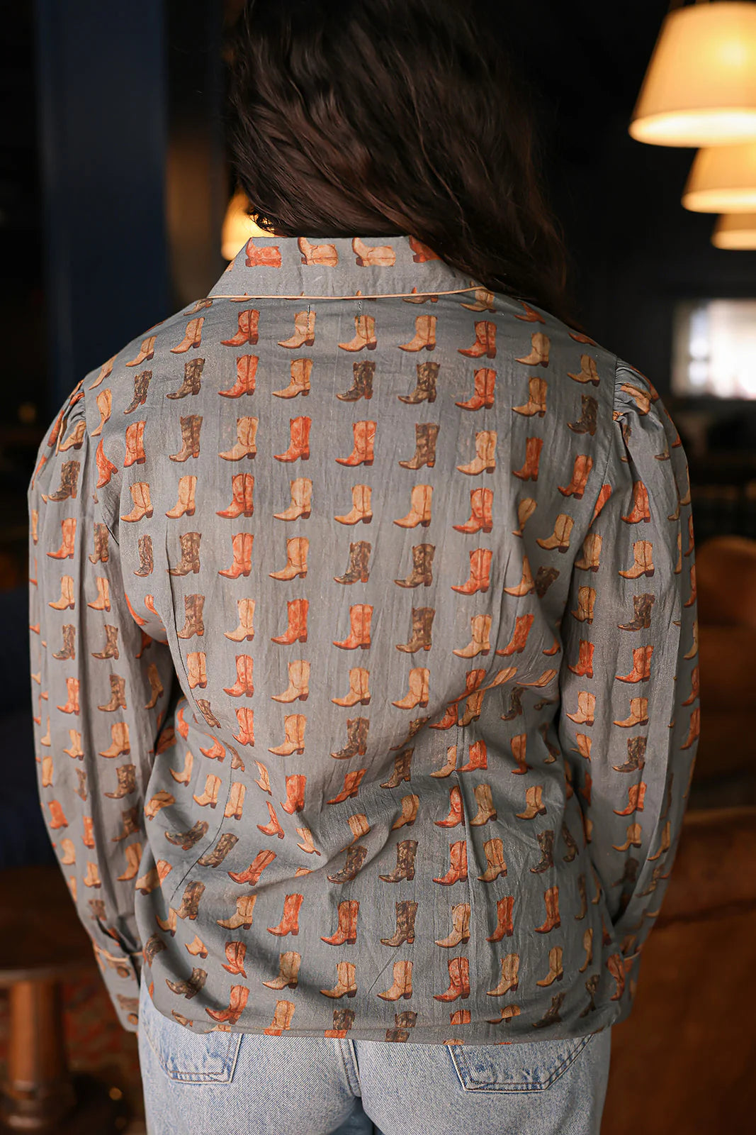 Made for cool days and country nights, and paired with denim jeans makes the perfect outfit. This long-sleeve top showcases detailed boot graphics across the front and back.