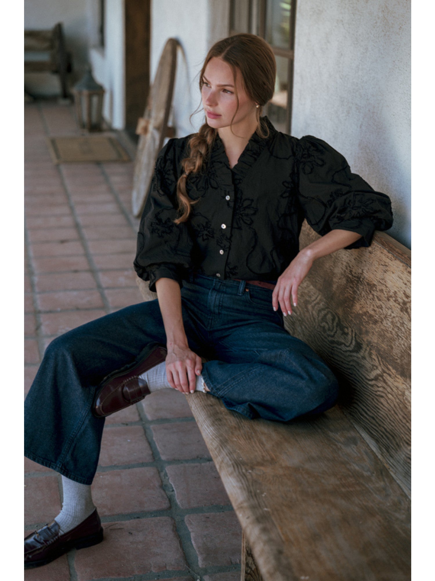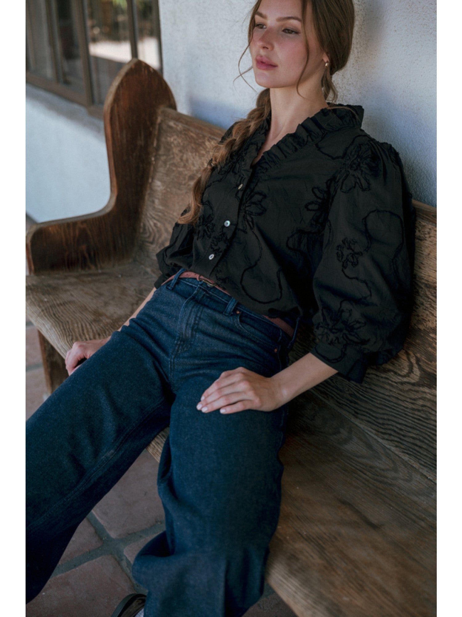 Elevate your wardrobe with this Raider Black Floral Appliqué Top featuring 3/4 sleeves and a refined button-down front. Crafted from textured fabric, it showcases a delicate 3D floral pattern that adds depth and elegance. The ruffled neckline enhances its sophisticated appeal, making it perfect for polished daytime looks or stylish evening outings.