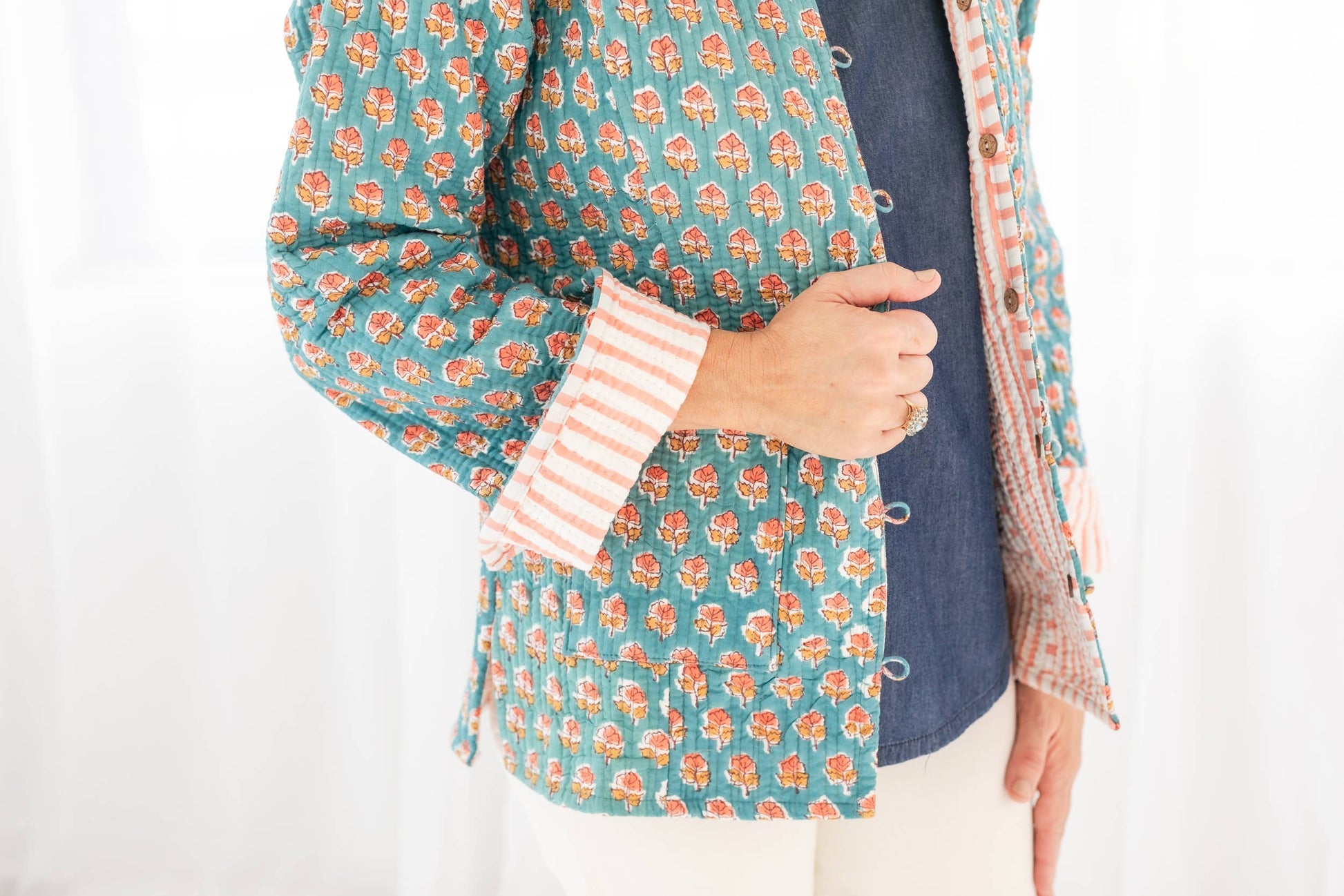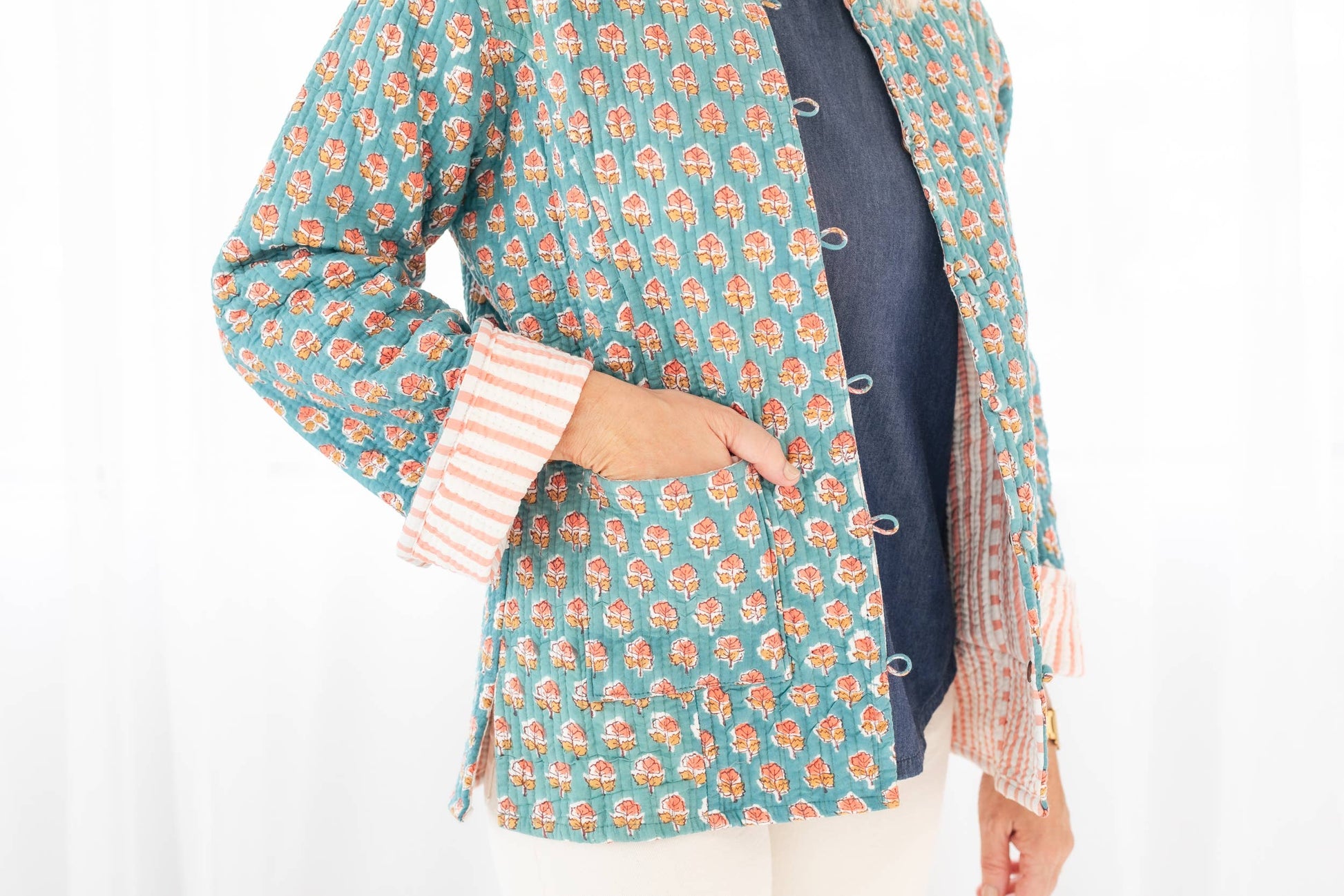 Stand out in this reversible quilted block print jacket featured in a tailored-style silhouette and stunning block print patterns on each side. Designed to add the perfect touch to any look. With its light weight feel, this is the perfect jacket for fall and year round. Dropped shoulders Quilt-inspired fabrication High-collar design