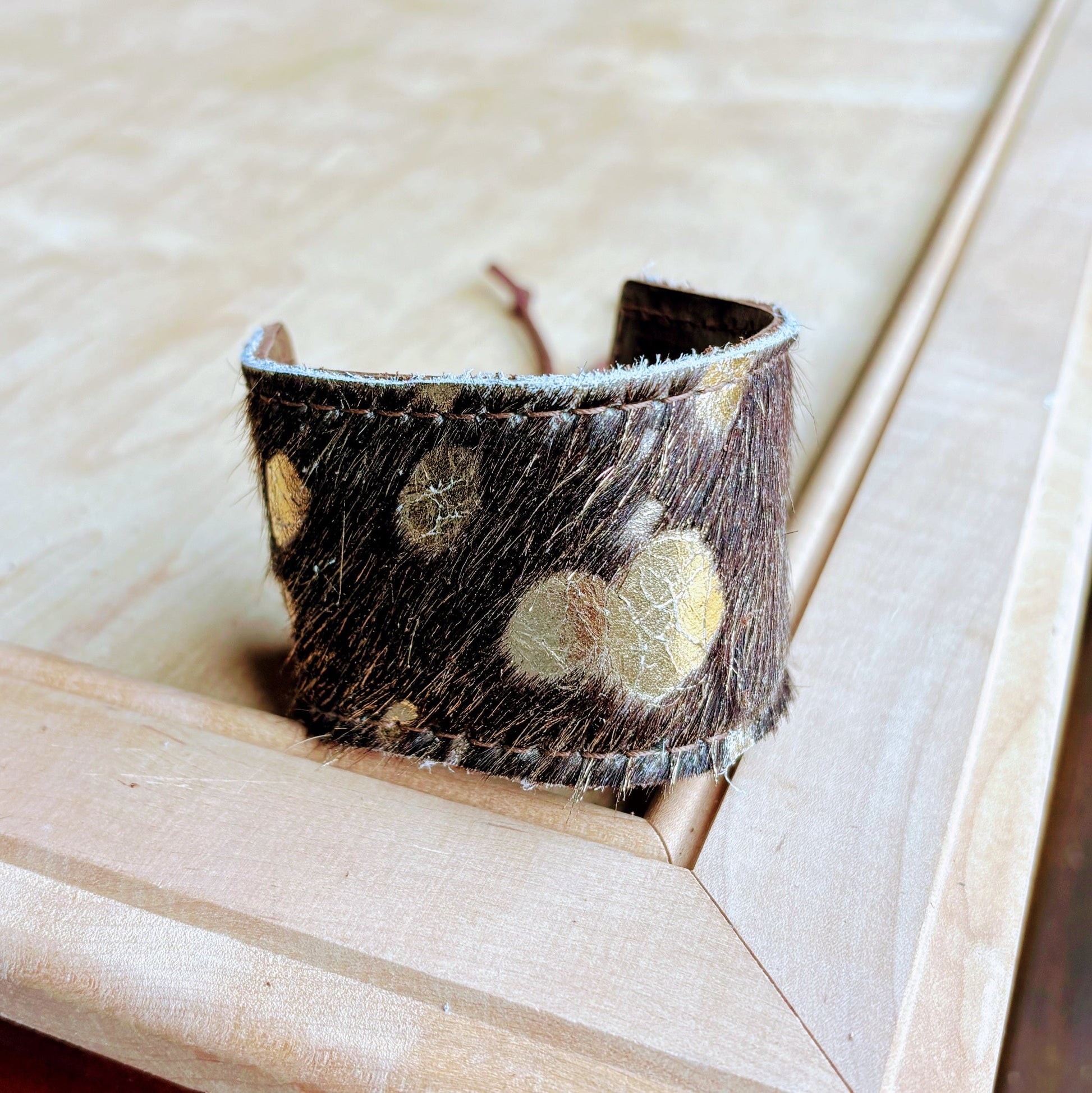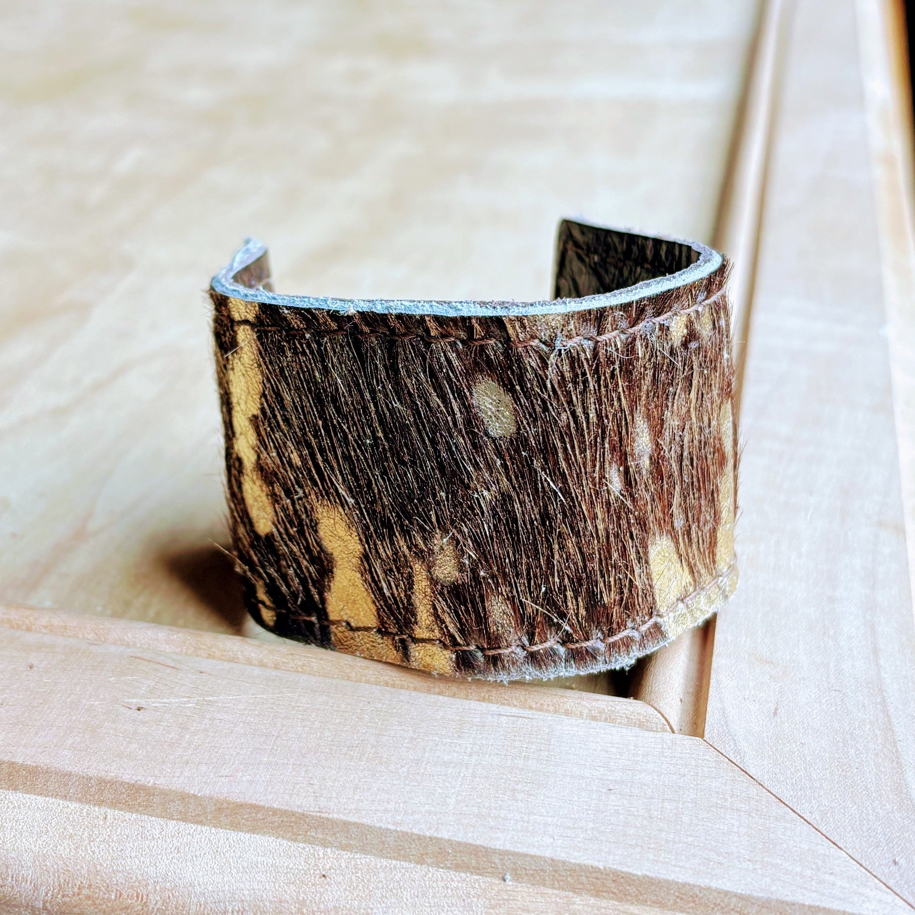 - Spice up your boho fashion jewelry collection with this wide leather cuff bracelet! Handmade with genuine, hair-on-hide leather, this unique cuff bracelet is the perfect statement piece to mix in with your other boho accessories. Wear it by itself or stack it with other pieces from our bracelet bar to create your own look. Order now!